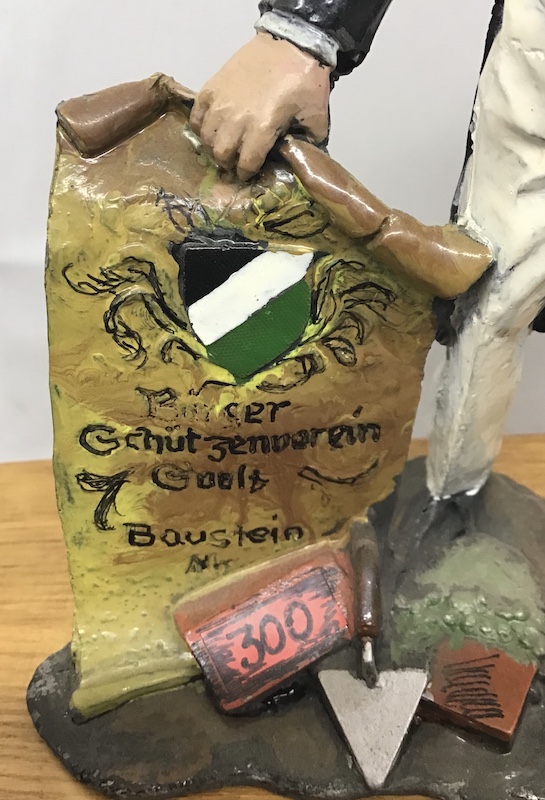 Der hier abgebildete, handbemalte, ist ein Sonderstück, das dem Kommandeur Hans Torley überreicht wurde. Bald wird er wieder im Schützenhaus zu besichtigen sein.