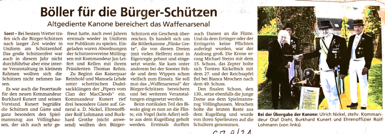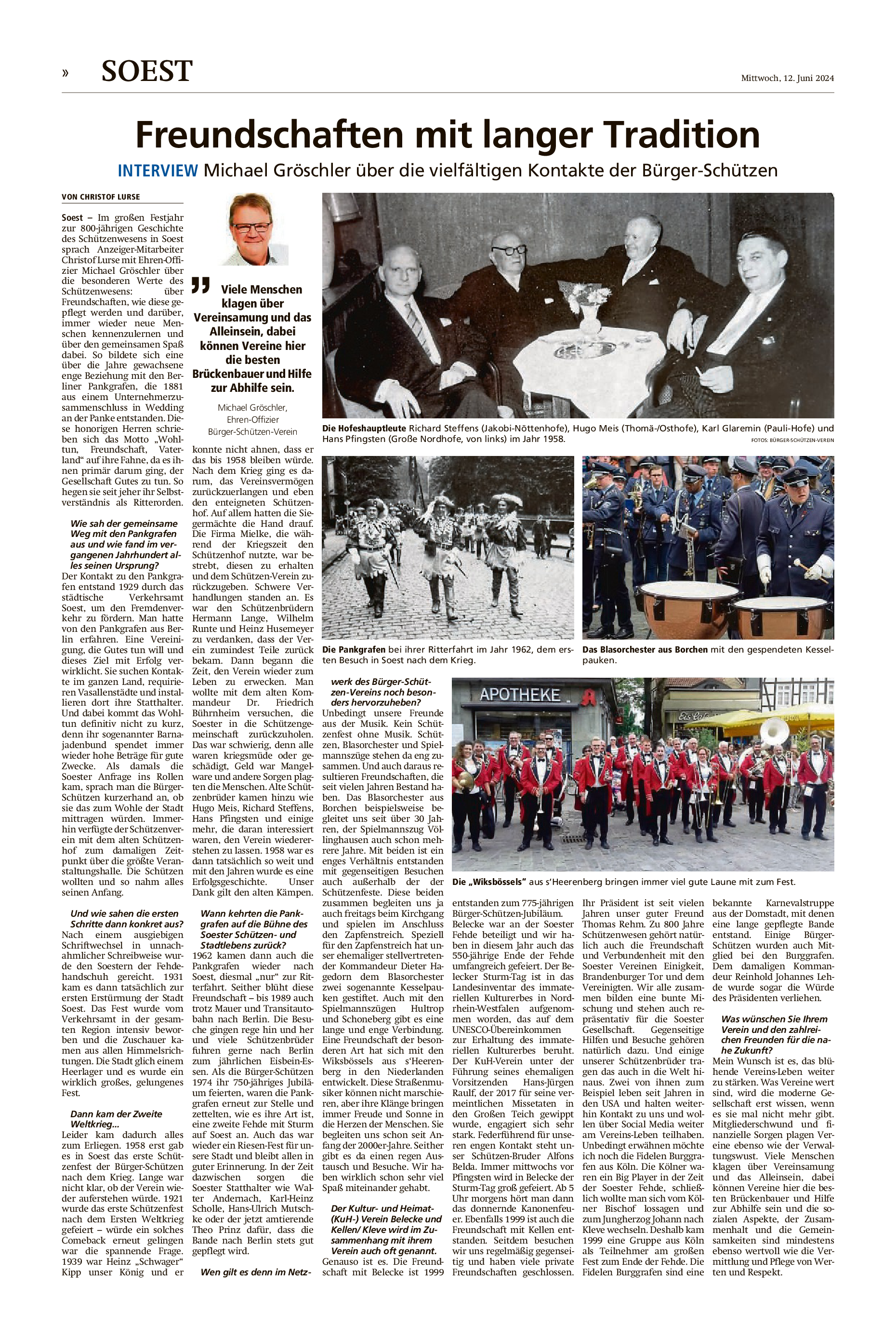 Seit 20 Jahren besteht die Freundschaft der Soester Bürger-Schützen und den Schützen aus Kellen-Kleve. begonnen hat die Verbindung anlässlich des großen Jubelfestes 1999 (750 Jahre Schützenwesen und 555 Jahre Soester Fehde).