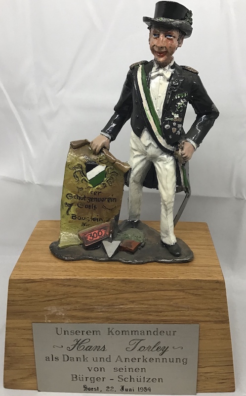 Der hier abgebildete, handbemalte, ist ein Sonderstück, das dem Kommandeur Hans Torley überreicht wurde. Bald wird er wieder im Schützenhaus zu besichtigen sein.